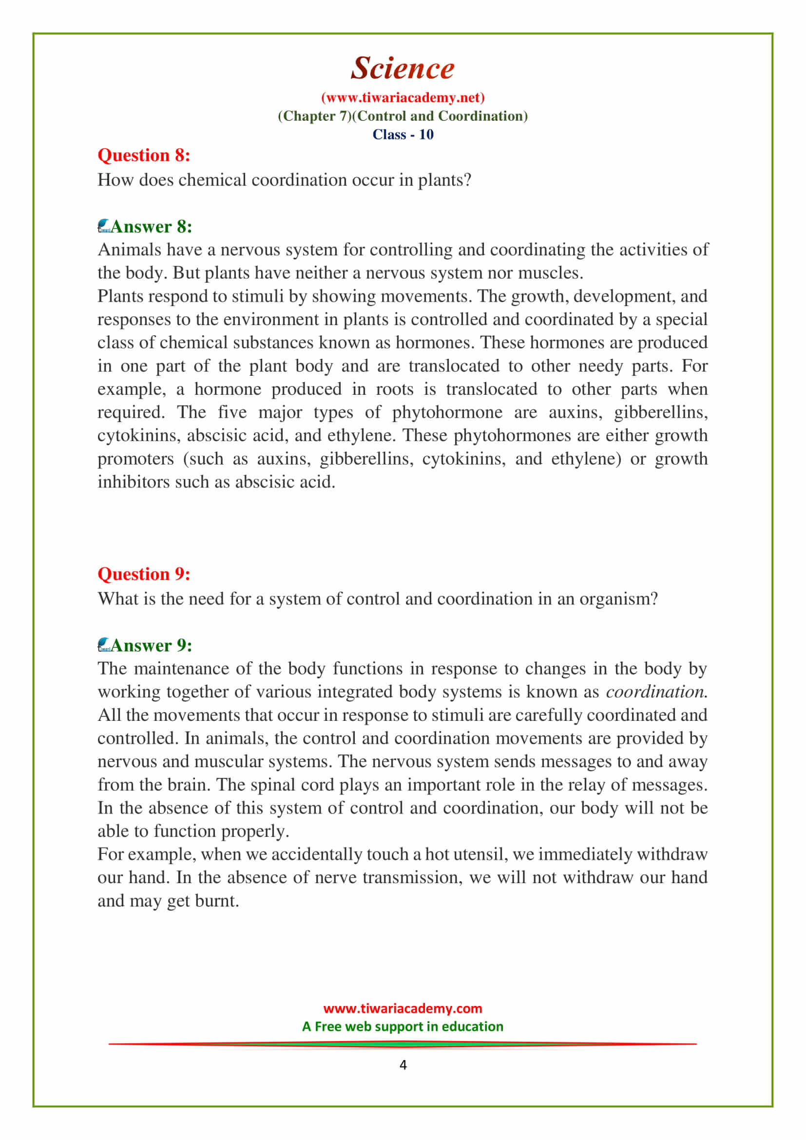 Cbse Class 10 Science Chapter 7 Control And Coordination Notes Free Pdf